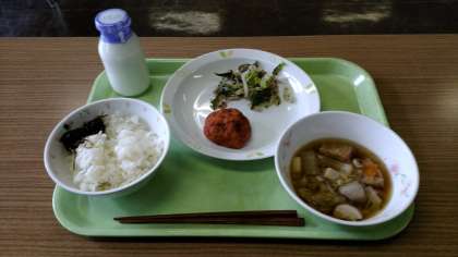 ご飯、のりとこんぶの佃煮、豆腐ナゲット、野菜のゆかりかけ、いもこ汁、牛乳
