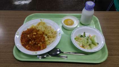 チリビーンズライス、ハニーサラダ、びっくり目玉焼き、牛乳