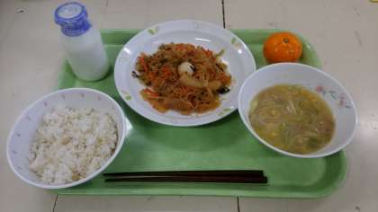 麦ごはん、大根と春雨の辛み煮、長ねぎのとろみスープ、みかん、牛乳