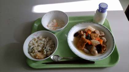 菜飯、おでん、フルーツヨーグルト、牛乳