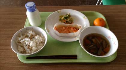 じゃこご飯、鮭のみそチーズ焼き、ごま和え、せんべい汁、みかん、牛乳