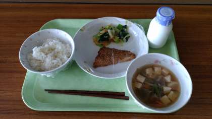ご飯、鯖のごまみそ焼き、野菜の昆布茶あえ、具だくさん汁、牛乳