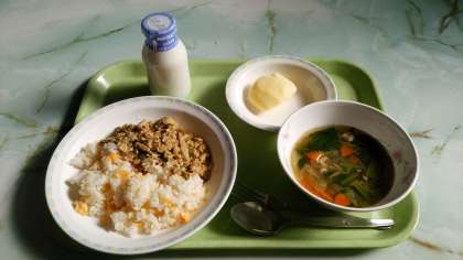 鶏肉のガパオ炒めご飯、ワンタンスープ、りんご、牛乳