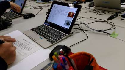 タブレットフル回転の技術の授業。住まいについて学ぶ家庭科の授業。ウィニペグ市の学校の先生も見学に来校されました。