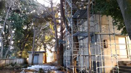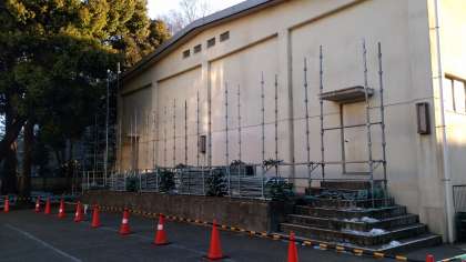 2月中、体育館屋根の塗装工事が行われます。足場が組まれるので、気を付けてください。