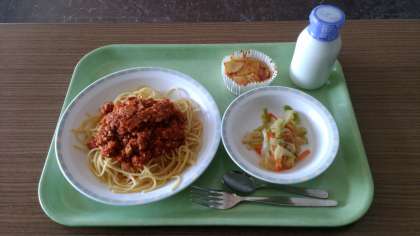 スパゲティミートソース、梅ドレサラダ、りんごのヨーグルトケーキ、牛乳