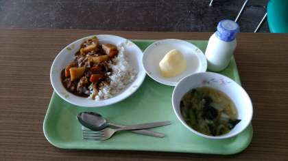 カレーライス、白菜とレンズ豆のスープ、りんご、牛乳