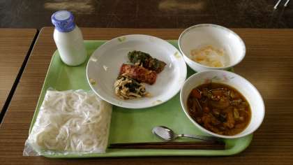 つけカレーうどん、竹輪の2色揚げ、大根とわかめのごまあえ、フルーツヨーグルト、牛乳