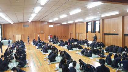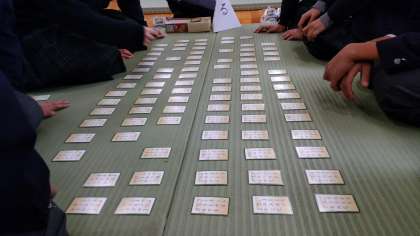 5校時の格技室からは、百人一首の読み手の声が聞こえてきます。会場いっぱいに広がった1年生が、静寂と歓声に包まれています。