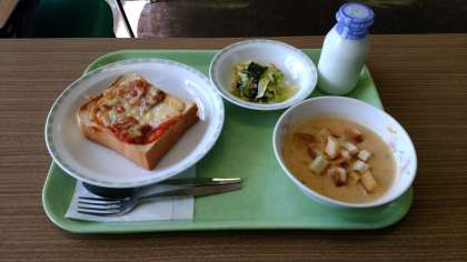 ピザトースト、キャロットポタージュ、フレンチサラダ、牛乳