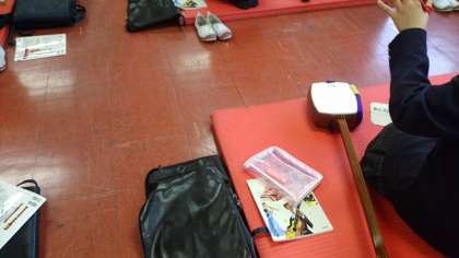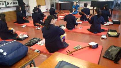 講師の先生の説明を聞きながら、楽器を手に取り、遠慮がちに音を出す姿が微笑ましい三味線教室です。