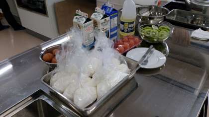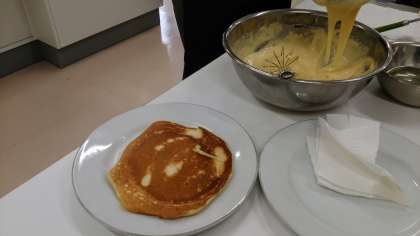 I組が調理室で楽しそうです。保護者の方と一緒に調理実習。おいしそうなホットケーキと果物が並びます。