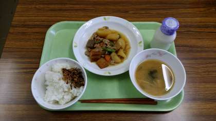 ご飯、かみかみ佃煮、肉じゃがうま煮、みそ汁、牛乳
