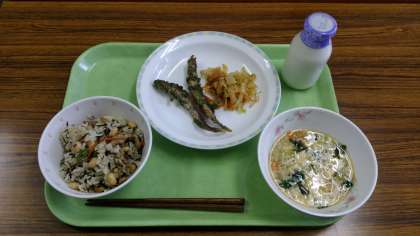 豆入りひじきご飯、ししゃもの磯辺揚げ、野菜のおかか和え、かきたま汁、牛乳