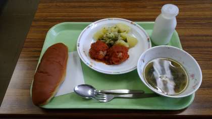 黒コッペパン、ミートボールのトマト煮、リエージュ風サラダ、青菜のスープ、牛乳