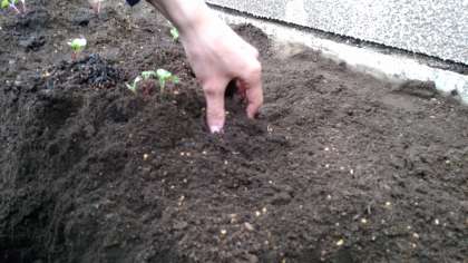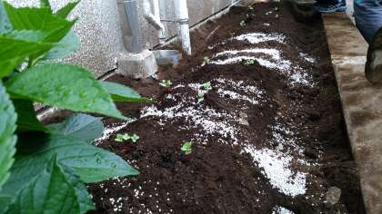 校内のI組農園に、はつか大根の苗を植えています。みんな楽しそうです。