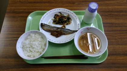 ご飯、さんまの生姜煮、大根とひじきのサラダ、あんかけ汁、牛乳