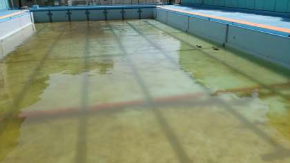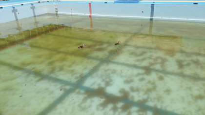 水泳の授業に備えて、準備が始まりました。ひと足早く、かもによる授業が始まっていま。