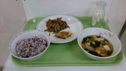 ゆかりご飯、さわらの変わりソース、五目きんぴら、吉野汁、牛乳