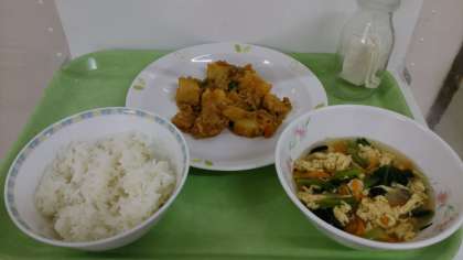 ご飯、マーボーじゃがいも、サンラータン、牛乳