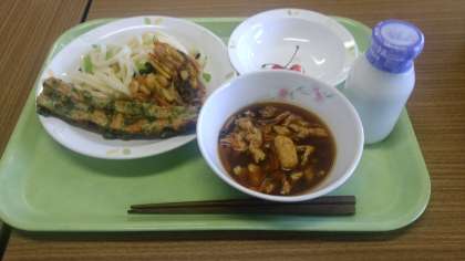 冷やしきつねうどん、天ぷら(かき揚げ、竹輪)さくらんぼ、牛乳