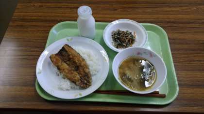 さんまかば焼き、ごま酢あえ、味噌汁、牛乳