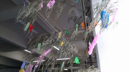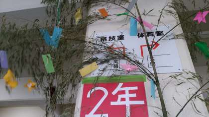 七夕の短冊を昼休みに書いている上級生がいました。「音楽祭 優勝!」の文字も見えています。願いが叶うか、夏の空は黙って見守っています。