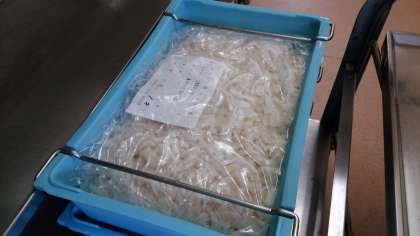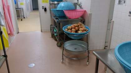 早朝、校舎が静まり返っている頃に、給食室付近は賑わいます。食材が次から次へと搬入され、その日の給食の準備が始まります。