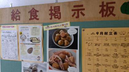 各フロアの給食掲示板には、秋にふさわしい食材が紹介されています。小さい秋を見つけることができますよ。