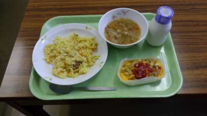 パエリア、スペイン風オムレツ、キャベツとベーコンのスープ、牛乳