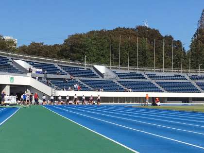 立派な競技場に、選手の姿が青空に輝いています。駒沢にも南風が吹いています。