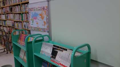 開館を目前に控えた図書室では、司書の方々による蔵書点検や掲示物の準備が行われています。来週開館を目指しての最終準備です。