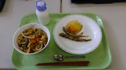 カレーうどん、ししゃもの磯部揚げ、スイートポテト、牛乳