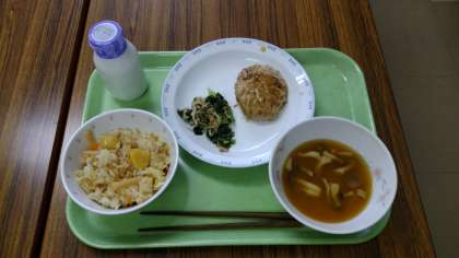 栗入り五目おこわ、豆腐入りさくさくつくね、切干とツナのごま酢、みそ汁、牛乳