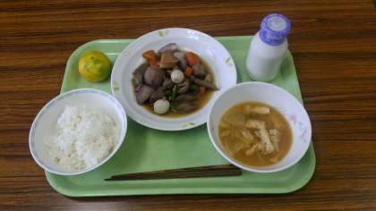 今日の給食 公開日 2018/10/12 更新日 2018/10/12 給食 献立名 ご飯、鶏肉と里芋のうま煮、味噌汁、みかん、牛乳 主な食材料産地 にんじん(北海道)ごぼう(青森)さといも(千葉)さやいんげん(秋田)だいこん(北海道)長ねぎ(青森)みかん(愛媛)鶏肉(岩手)たけのこ缶(熊本) 今週も最後の1日となりました。音楽祭を終え、校内がゆったりしている感じです。 いいね(0)