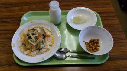 あんかけチャーハン、大豆とじゃこの甘辛あげ、りんご、牛乳