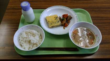 麦ごはん、ひじき入り卵焼き、彩りきんぴら、のっぺい汁、牛乳