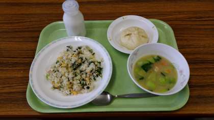 青菜とじゃこのチャーハン、肉まん、コーンスープ、牛乳