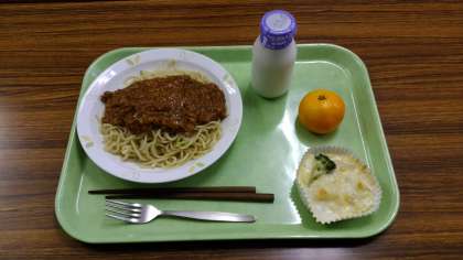 ジャージャー麺、じゃがいものチーズ焼き、みかん、牛乳