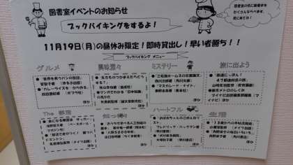 先日の「処方図書」は大人気でした。今度は「ブックバイキング」です。図書室の机に多くの本が並びます。是非図書室に来てください。