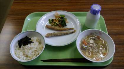 発芽玄米入りごはん、のりとこんぶの佃煮、ししゃものから揚げ、豆もやしの塩ナムル、豚汁、牛乳
