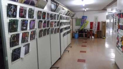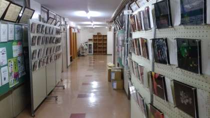 職員室前の廊下が美術館になりました。「ウオッチストリート」時計の動く音にも耳を澄ませてみてください。