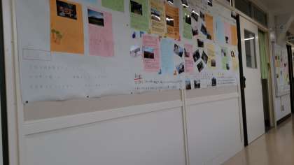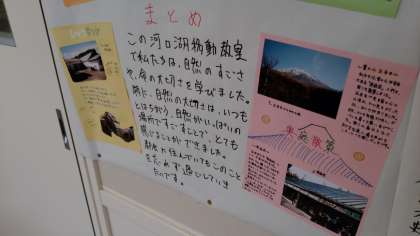 河口湖移動教室の新聞が掲示されました。きれいな富士山が並びます。