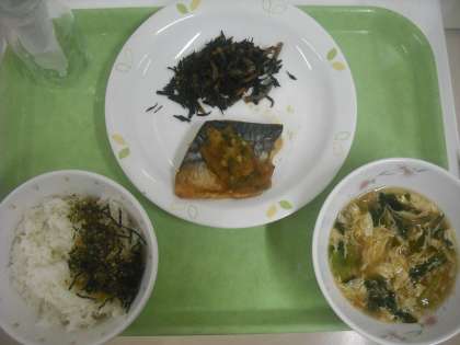 ごはん、青のりふりかけ、鯖のみぞれがけ、ひじきの煮付け、かきたま汁、牛乳