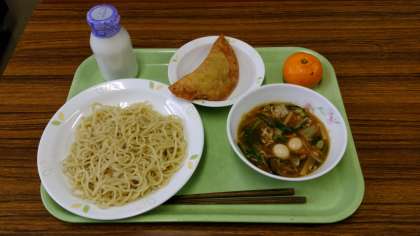 しょうゆラーメン、ジャンボぎょうざ、みかん、牛乳