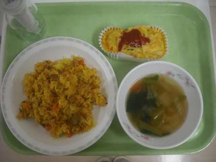 カレーピラフ、チーズスペイン風オムレツ、野菜スープ、牛乳