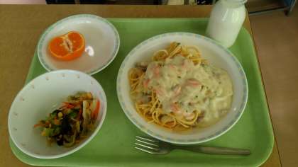 スパゲッティクリームソース、わかめサラダ、ぽんかん、牛乳