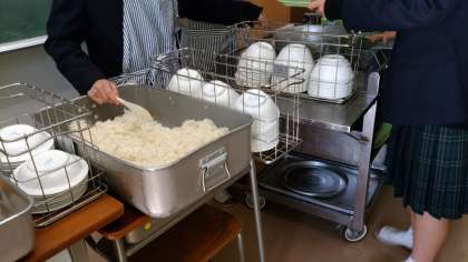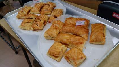 今日の給食にはデザートがついたクラスがありました。家庭科の調理実習で作ったアップルパイが並びます。