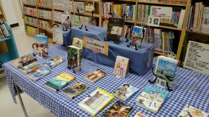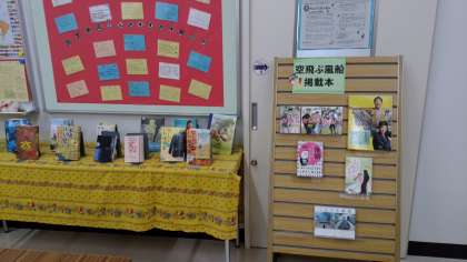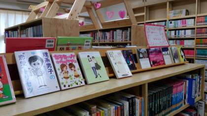図書館人気の本が紹介されています。2月を迎え、バレンタインモードに図書館がデコレーションされています。
