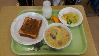 セサミトースト、コーンシチュー、炒り卵サラダ、いよかん、牛乳